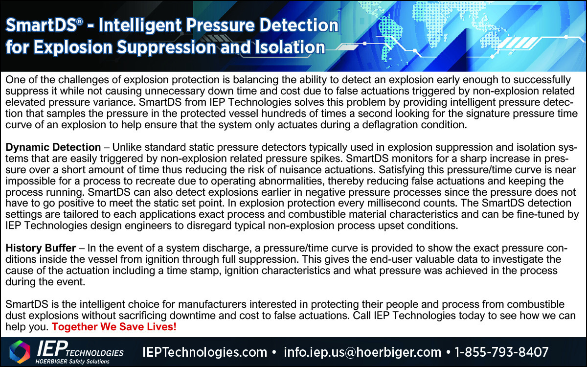 SmartDS is the intelligent choice for manufacturers interested in protecting their people and process from combustible dust explosions without sacrificing downtime and cost to false actuations. Call IEP Technologies today to see how we can help you. Together We Save Lives!